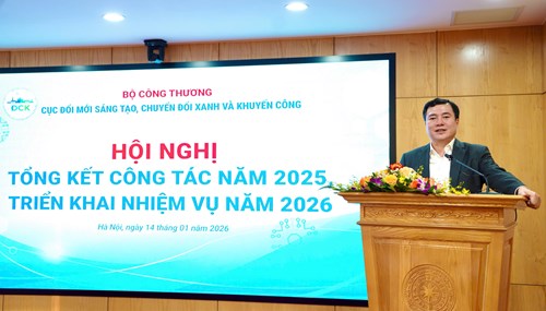 Chiều ngày 14/1/2026, Cục Đổi mới sáng tạo, Chuyển đổi xanh và Khuyến công (Cục ĐCK) tổ chức Hội nghị tổng kết công tác năm 2025, triển khai nhiệm vụ năm 2026. Thứ trưởng Bộ Công Thương Nguyễn Sinh Nhật Tân tham dự và phát biểu chỉ đạo Hội nghị.
